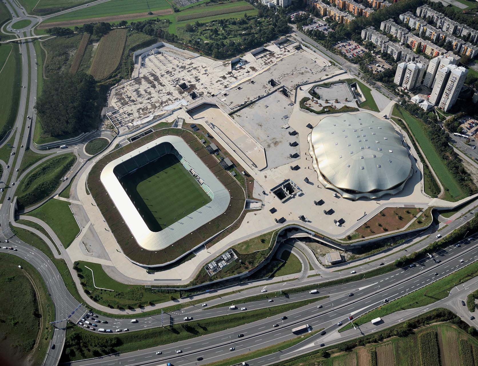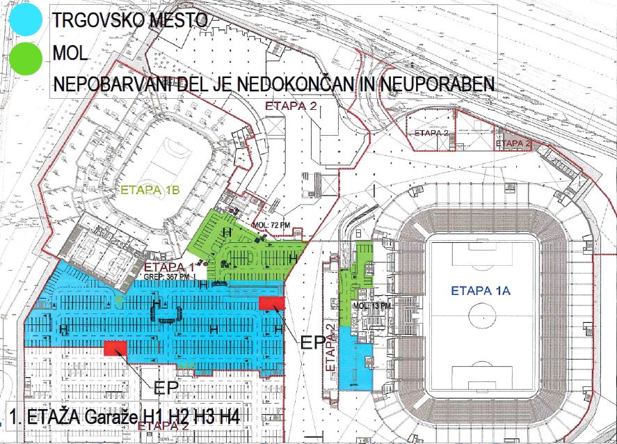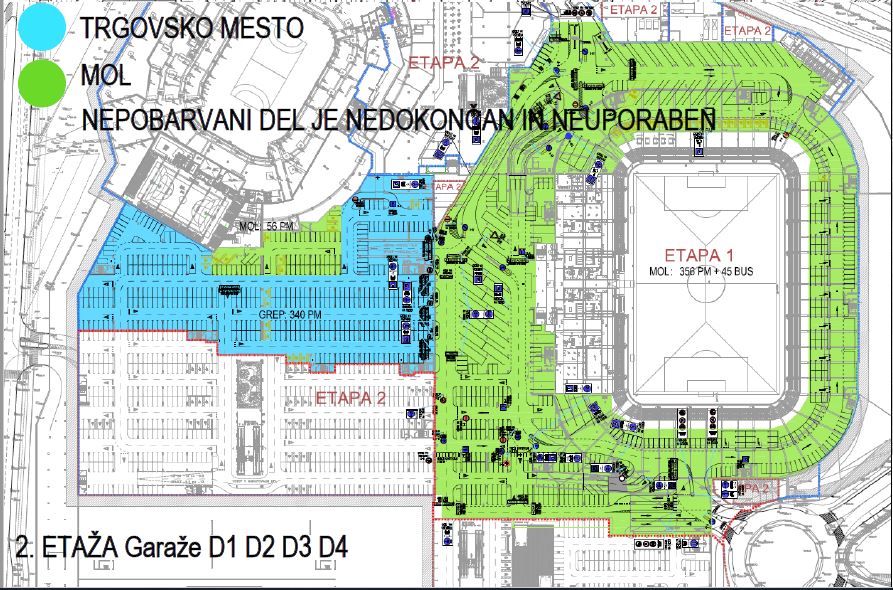 TRGOVSKO MESTO, d.o.o. je lastnik parkirnih mest v garažni hiši ŠC Stožice (1. ETAŽA garaže H1, H2, H3, H4 in 2. ETAŽA garaže D1, D2, D3, D4) ter nedokončanega trgovskega dela Stožic s pripadajočo ploščadjo ob stadionu Stožice.